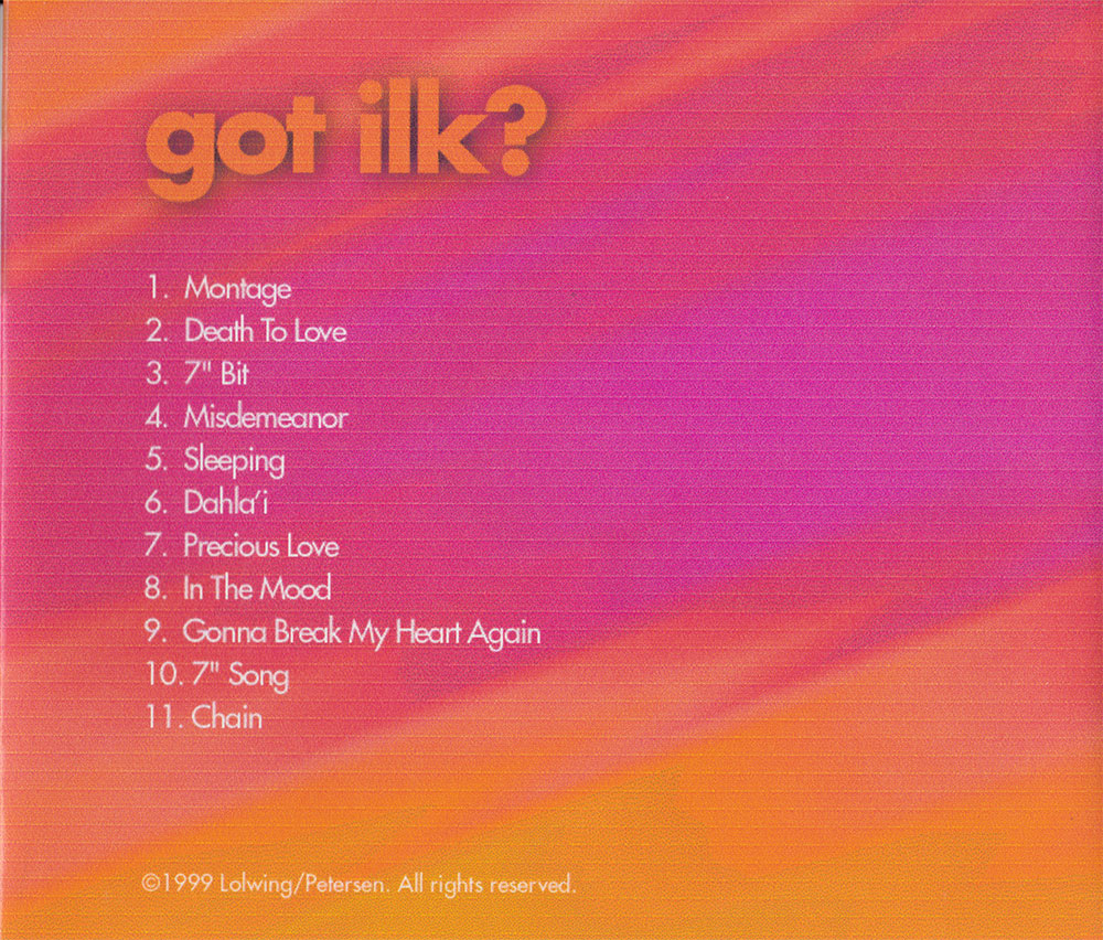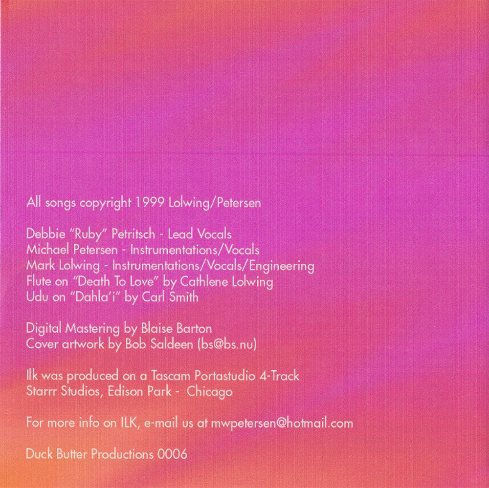 For this 1999 project, We the Cats songwriters Mike Petersen and Mark Lolwing team up again with blue-eyed soul singer Ruby Petrisch to concoct an interesting mix of moody rock with Ilk. Self-recorded on an analog 4-Track in a Chicago basement, this low-fi experiment boasts some of their most interesting soundscapes.